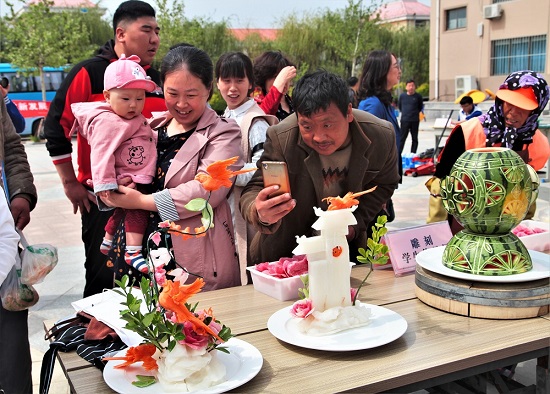而在另一边,餐旅服务部学生们雕刻的花样菜品同样十分吸人眼球。他们现场展示雕花和切丝技艺,吸引了不少居民前来学艺。一块普通的红心萝卜在学生手中很快就能变成一朵美丽的鲜花,在一旁观看的居民颇感兴趣。学生一边雕刻一边和居民们交流,临走时将雕刻好的萝卜花送给居民,让居民们十分开心。同时,学生们还为居民们展示了切丝技艺,并将切好的土豆丝免费发放给路过的居民。看到学生们切的土豆丝粗细均等,几名家庭主妇向他们树起了大拇指。